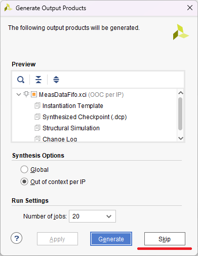 Создаем проект и добавляем в него сурс файлы из отделього репозитория, а так же все необходимые IP блоки. При добавлении IP блока, после его конфигурации НЕ НУЖНО генерировать все файлы для данной IP, для этого нужно нажать кнопку skip (см. скриншот).